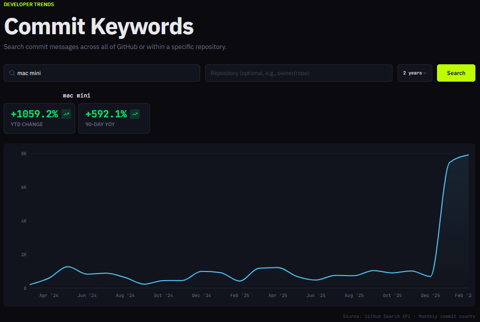 And this preference is not just reflected by people on X either. I used our brand new Sentinalysis Research Platform to search for specific keywords in GitHub commits. Although total mention frequency is relatively small, the term “mac mini” has skyrocketed recently: