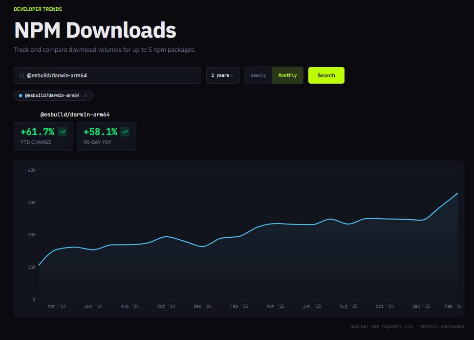 We also used the NPM package download feature on the Sentinalysis Research Platform to identify some Mac-specific software packages (with the help of my trusty friend Claude, of course) that would be a good proxy for Mac usage:
